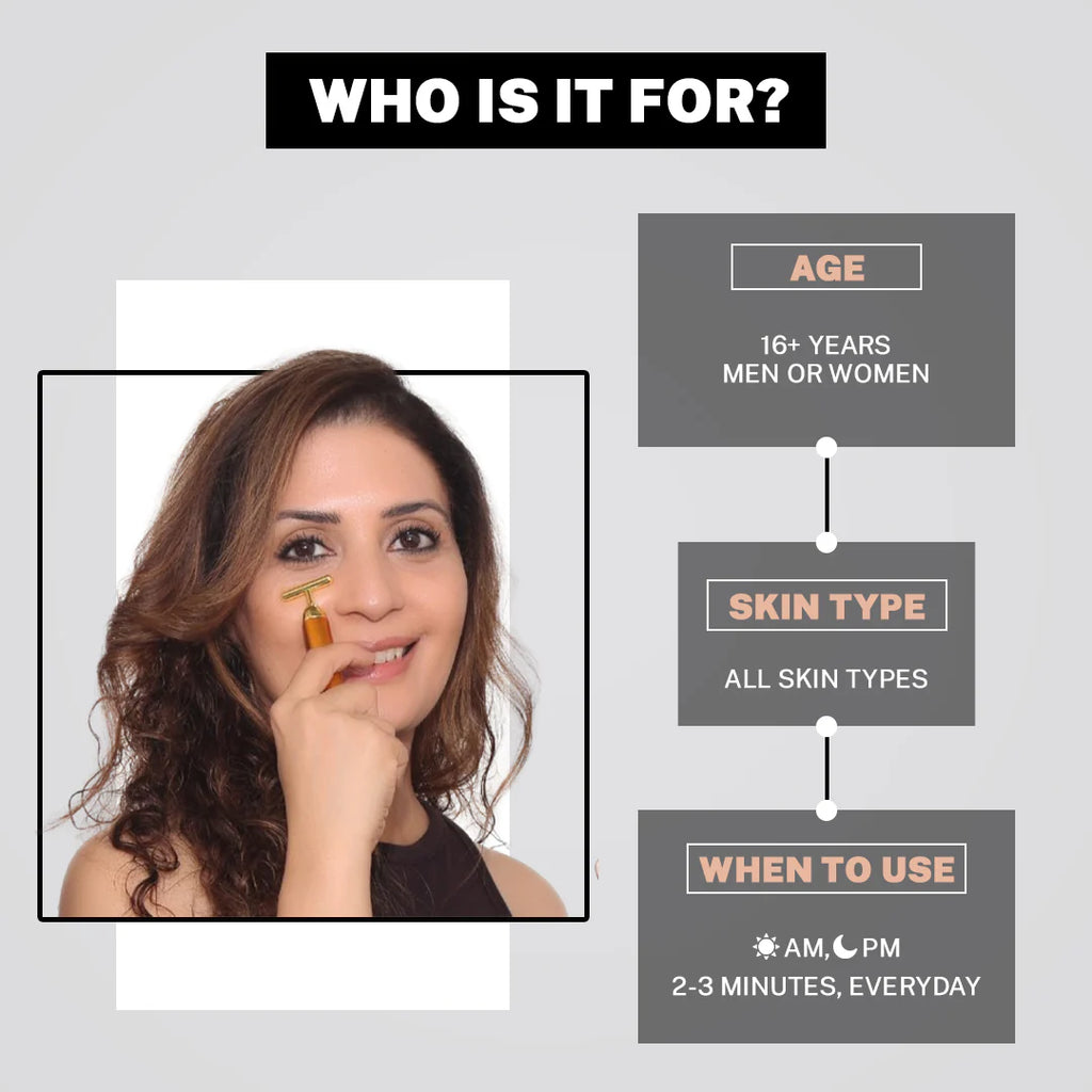 🔹 Material: Aluminum & Brass with 24K Gold Finish ✨✅ T-Shaped Head: Gentle vibrations to massage facial muscles, improve circulation, and relax tension.